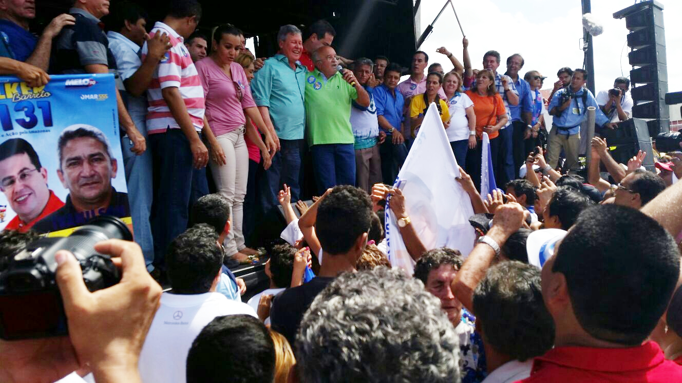 O prefeito Artur Neto ( PDSB). entrou forte na campanha do governador José Melo(PROS), durante comício na Zona Leste de Manaus, desfazendo boatos de que não se empenharia na reeleição do atual governador. Além de dizer que vota em José e pedir votos para ele, Artur lembrou que não há opção melhor para o Amazonas. O prefeito tambem criticou aquela moça - numa referência a presidente Dilma - "que veio a Manaus entregar casas do Viver melhor e prometeu recursos para obras de infraestrutura no Amazonas, mas que não manteve a palavra". A presença de Artur no comício e o discurso contudente que fez desfazem os boatos de que não se empenharia na campanha de José.