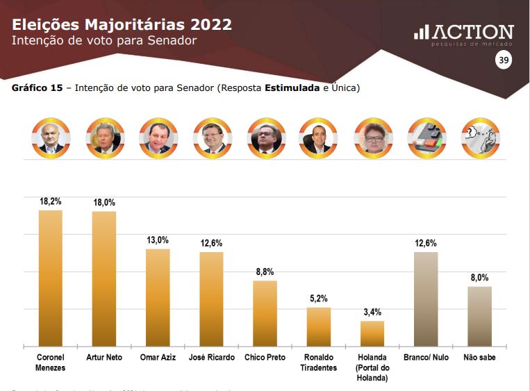 O Senado abre uma vaga para o Amazonas e a disputa não parece fácil para ninguém. Menezes aparece na frente, seguido de Arthur Neto e Omar Aziz. É o retrato que a pesquisa captou, mas muita coisa pode mudar até outubro. Veja a pesquisa, realizada em Manaus entre os dias 8 e 11 de novembro com 996 eleitores , com margem de erro de 3,5 por cento para mais ou para menos. Aqui no pé da coluna, na íntegra:
