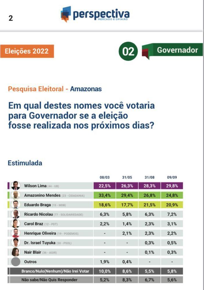 A surpresa está no crescimento do governador Wilson Lima que lidera com 29,8%. Se prevalecer esses números, a grande disputa vai ser pela segunda vaga. Braga é o candidato com grande rejeição do eleitorado de Manaus, inclusive no PT, mas rompeu algumas barreiras nas últimas semanas. É tinhoso, decidido e neste momento uma ameaça real ao ex-governador Amazonino Mendes.