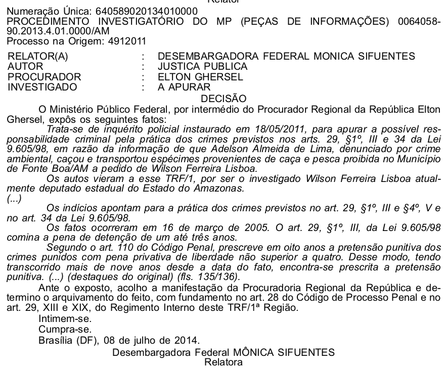 O deputado Wilson Lisboa (PCdoB)) denunciado pela Procuradoria da Repoública por ter mandado um funcionário caçar e transportar espécimes da fauna no municipio de Fonte Boa, em 16 de março de 2005, se livrou da pena restritiva de liberdade porque o crime prescreveu. A desembargadora federal Mônica Sifuentes mandou arquivar o processo. Caso fosse condenado, Lisboa teria o nome inserido como Ficha Suja e não poderia disputar a eleição deste ano.