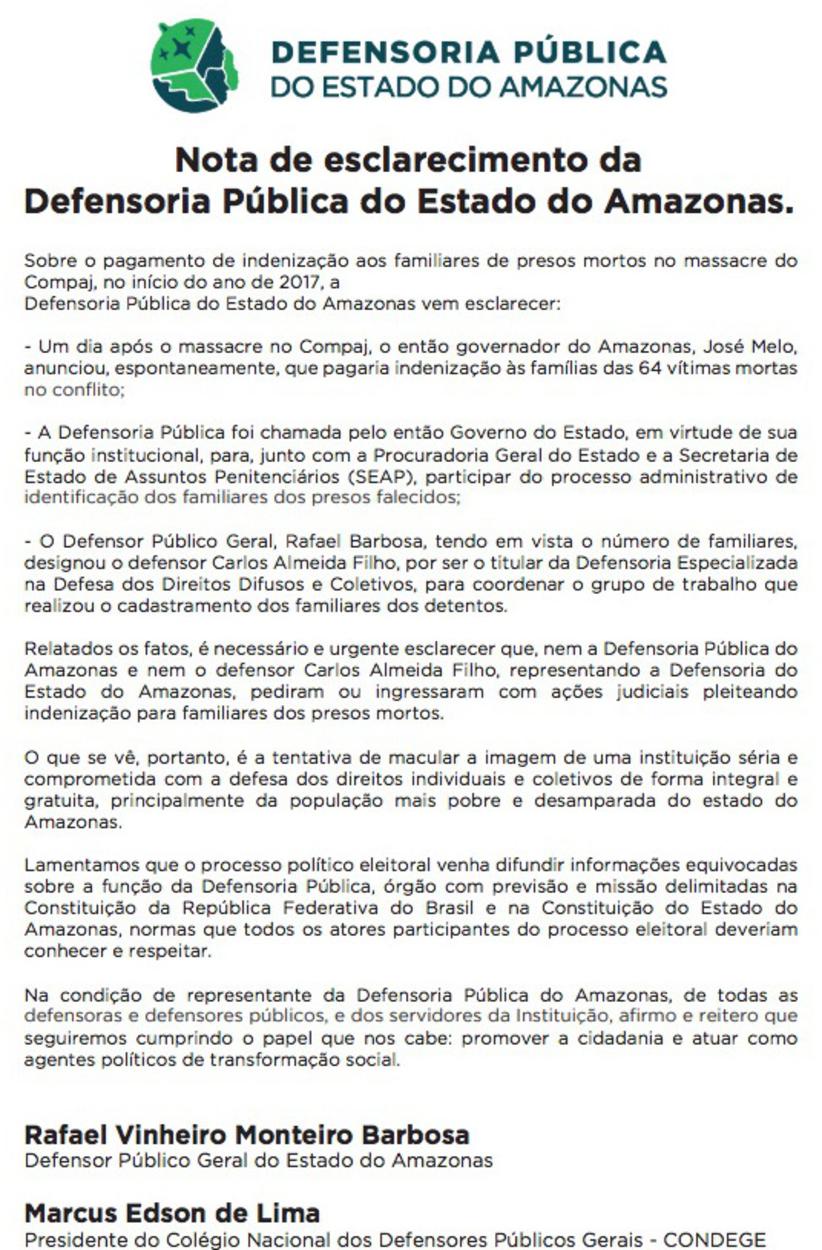 Ninguém quer assumir a responsabilidade pelo pagamento de indenização às famílias de criminosos mortos em guerra de facções no Compaj. Nem a Defensoria Pública, que emitiu uma estranha nota neste sábado, dizendo que não ingressou com nenhuma ação judicial contra o Estado, quando seu dever constitucional era entrar, inclusive ajuizando ação civil pública, em nome das famílias, ou tentar um acordo extrajudicial, que era o caso.