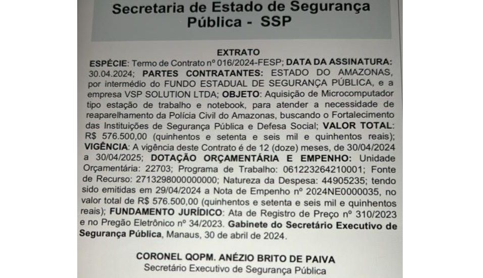 A gastança ocorre em todos os setores. A Polícia Civil acaba de adquirir "microcomputador tipo estação de trabalho e notebook para atender as necessidades de reaparelhamento das instituições de segurança" junto a VSP Solution Ltda, a um custo de R$ 576.500,00.