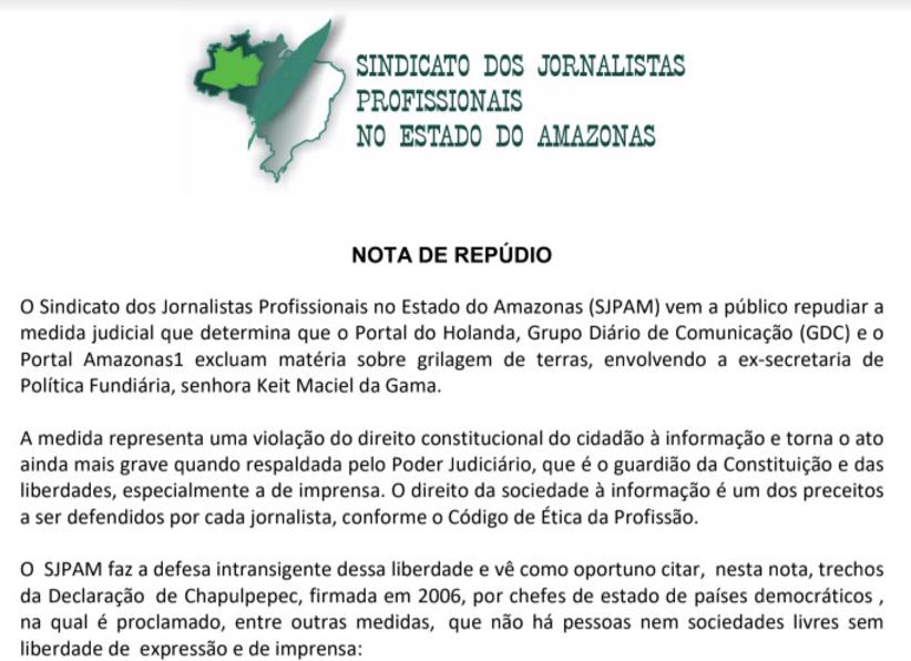 O Sindicato dos Jornalistas do Amazonas saiu em defesa da liberdade de imprensa e opinião, ao estranhar, em nota, medida judicial que manda excluir do Portal do Holanda , Portal Amazonas 1 e Grupo Diário de Comunicação noticia que revela iniciativa do Ministério Público Federal em mandar investigar a ex-secretária de Assuntos Fundiários, Keit Maciel da Gama, ligada ao vice Governador Carlos Almeida, por grilagem de terras da União.