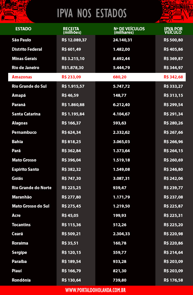 O Amazonas arrecada R$ 233,09 milhões anualmente com IPVA, imposto que é cobrado em média a R$ 342,68 por carro. No Estado, são 680 mil veículos, considerando a frota de automóveis, motocicletas e caminhões . É um dos maiores impostos recolhidos no País. O Amazonas só perde para São Paulo, Distrito Federal, Minas Gerais e Rio de Janeiro. Pior é a contrapartida em serviços. O centro de treinamento utilizado pelo Detran para testar novos motoristas é uma verdadeira cratera e no órgão o serviço funciona mal, há denúncias de corrupção, envolvendo funcionários, como o derrame de carteiras falsas ocorrida no final do ano passado.