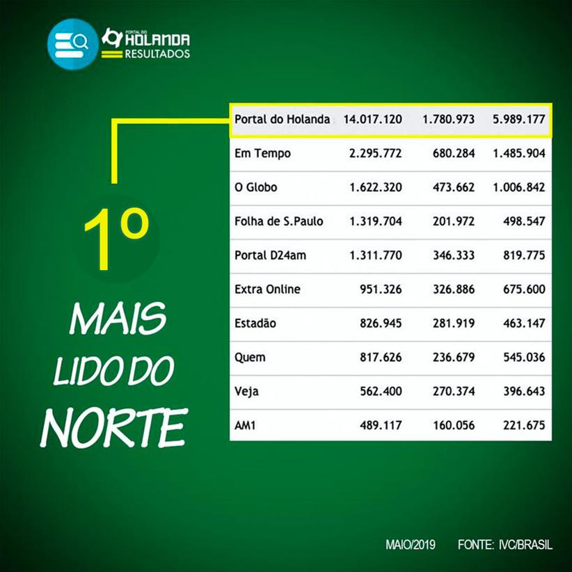 Entre os sites auditados pelo IVC o Portal do Holanda aparece na 14a colocação, com mais de 23 milhões de visualização