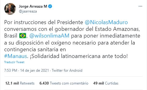 Veja a data do Twitter do ministro das Relações Exteriores da Venezuela, Jorge Arreaza, ofertando o insumo vital para salvar vidas em Manaus.