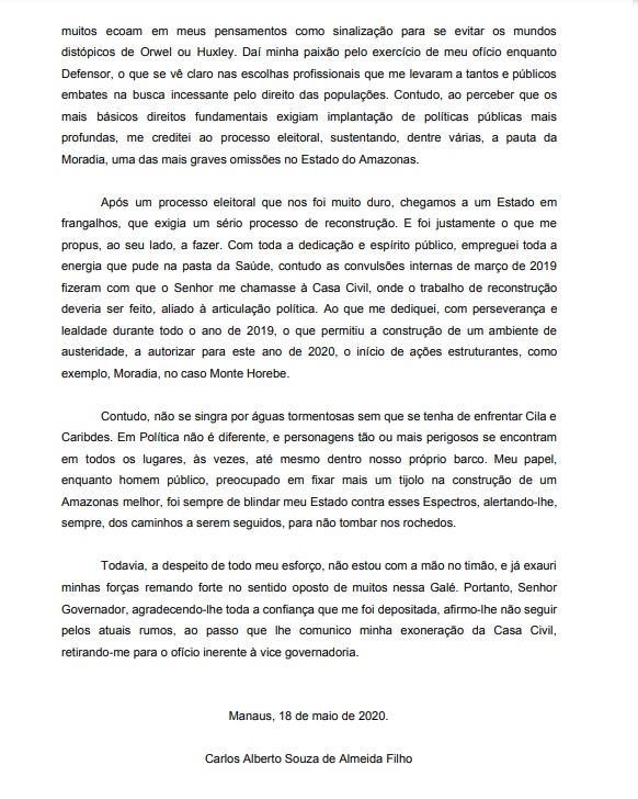 Na mesma carta, o vice governador adverte que esses personagens se encontram dentro do governo e que ele vinha lutando "contra esses espectros", mas admite impotência para afastá-los, pois que era apenas um vice. Deu no que deu. O Estado entrou em declínio com a crise na saúde, onde se revelaram os Cilas e Caríbdis, com a compra superfaturada de respiradores e outros insumos. Depois, o caos, com a segunda onda e mais de 9 mil mortos.