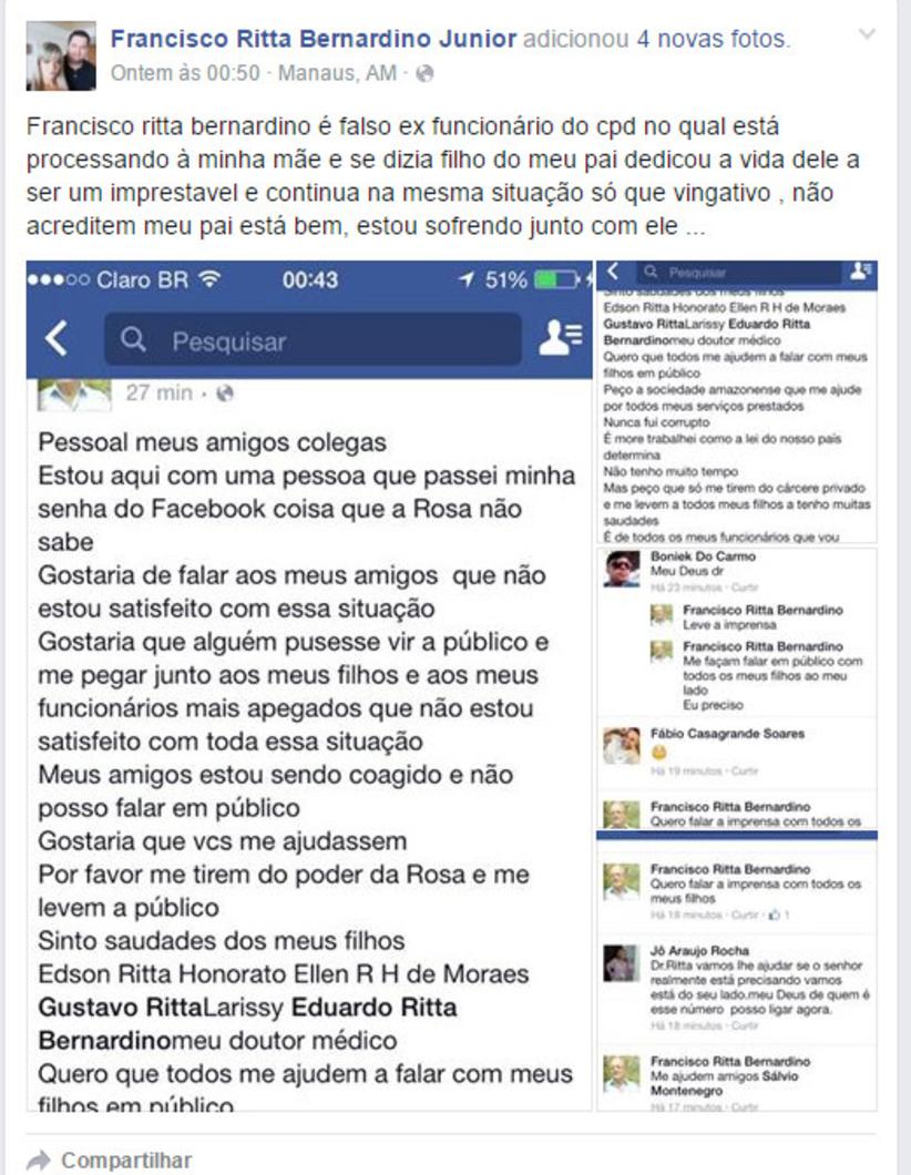 O pedido de socorro do empresário Ritta Bernardino, em sua página no Facebook, foi respondido pelo filho, também Ritta, o Júnior, com indignação. Segundo Jr, a senha do pai foi usada de forma criminosa por outra pessoa. Dias antes o mesmo JR divulgou vídeo do Ritta Bernardino no qual o empresário, de viva voz, desfaz boatos de que estaria sendo mantido refém.