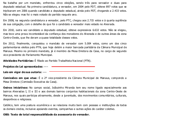 O site da Câmara Municipal de Manaus revela que o vereador Joaozinho Miranda não tem nenhum projeto de lei apresentado. A coluna Bastidores de anteontem questionou a inatividade do vereador, que em tese ganhou um mandato do eleitorado de Manaus exatamente para legislar. Mas João usou a tribuna, na sessão de quarta-feira para atacar o Portal, dizendo que durante o primeiro semestre apresentou três projetos de lei. O Portal do Holanda prefere se pautar em dados oficiais ( veja abaixo ), disponibilizado pela própria Câmara de Vereadores. Se Joaozinho de fato apresentou os projetos, como afirma, deve se reportar à direção da Câmara, que deixou de registrar essa ocorrência em sua página na Internet.
