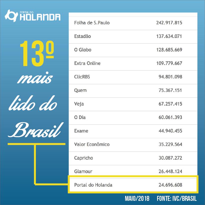Dos 86 sites auditados pelo IVC, o Portal do Holanda é o 13o no Brasil, com mais de 24,6 milhões de visualizações no mês de maio.