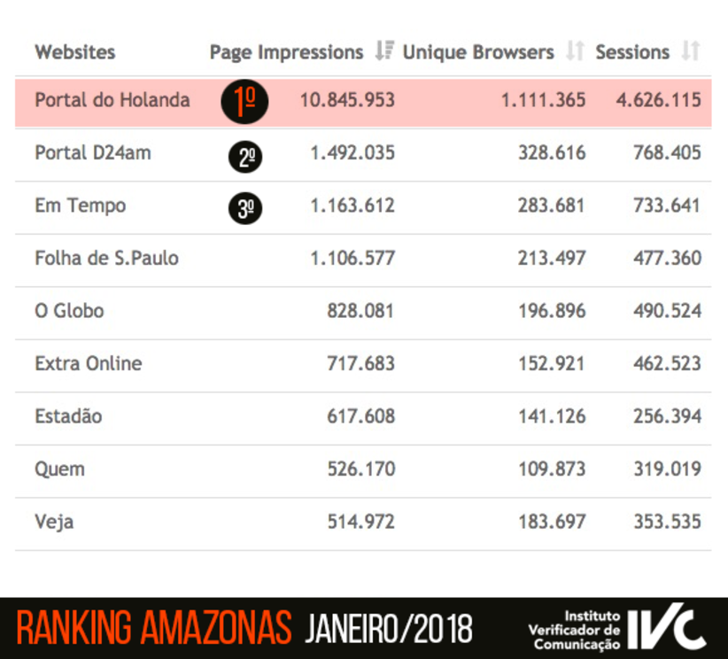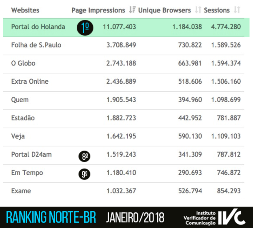 Parece uma repetição, mas não é. São números rigorosamente auditados pelo IVC, com base em padrões internacionais do IFABC (International Federation of Audit Bureaux of Certification)" , que mostram novamente o Portal do Holanda como o 13o site mais acessado no Brasil e o primeiro na região Norte.