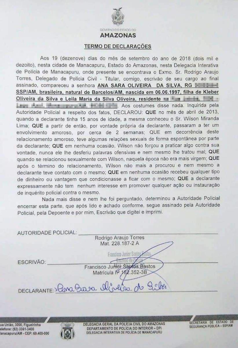 O candidato Wilson Lima obteve alguns ganhos nesta quarta-feira. 1- Ana Sara, com quem teria mantido um romance, amenizou as acusações contra ele : em depoimento à Polícia a mulher confirmou que fez sexo com o apresentador em 2013 (a versão anterior era 2012), disse ainda que nada foi forçado, que na ocasião não era mais virgem e que também não sofreu ameaças. Em video gravado quatro dias antes, ela afirmou que houve ameaça após publicar uma foto com o apresentador no Facebook e que foi obrigada a entregar a senha a Wilson, que apagou seu perfil na rede social.