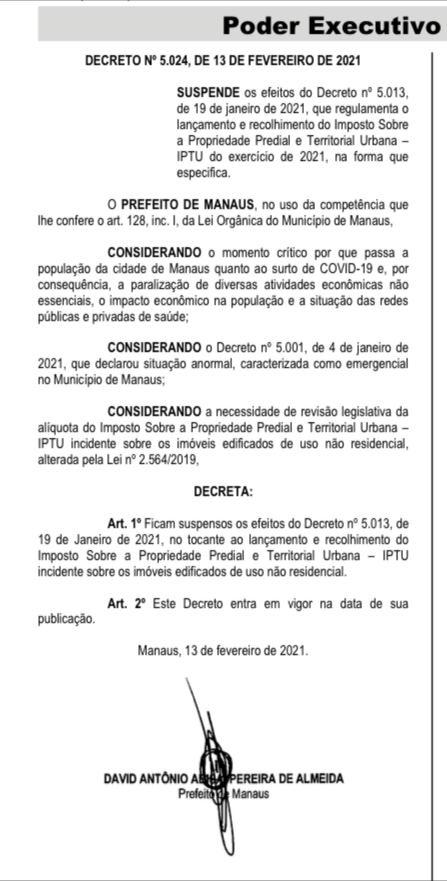 Agora tem a questão do IPTU. As redes sociais estão cheias de inverdades. Uma delas a de que o prefeito revogou decreto assinado pelo ex-prefeito Arthur Neto, que estabelecia novos parâmetros para cobrança do imposto este ano. O decreto, cuja vigência foi suspensa por David, considerando os impactos da pandemia na vida dos contribuintes, foi iniciativa dele. Assinado em 19 de janeiro deste ano, portanto cerca de 20 dias após tomar posse.