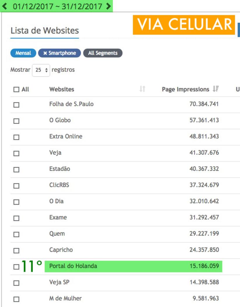 Confira clicando A Q U I a audiência do Portal do Holanda, o número de usuários e sessões abertas em dezembro, segundo o IVC.