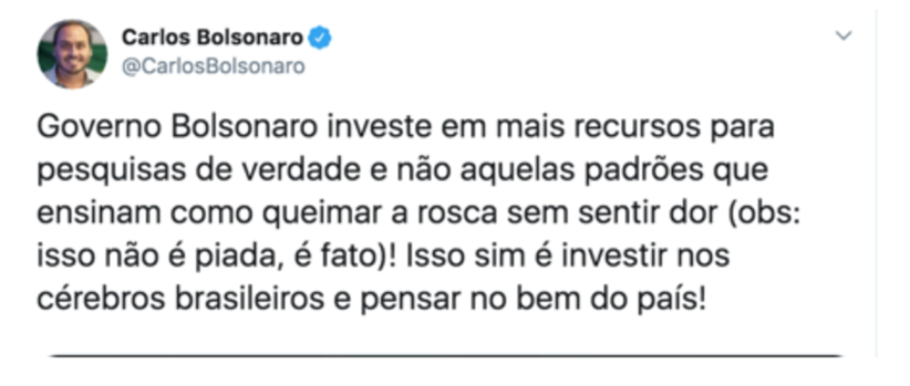 O ‘queimar a rosca sem sentir dor ’ de Carlos Bolsonaro, até que revela uma verdade: o país está saindo “da condição de chacota internacional em pesquisas”, para ser motivo de piadas pelo baixo nível dos governantes.