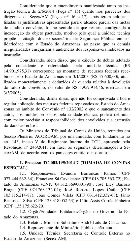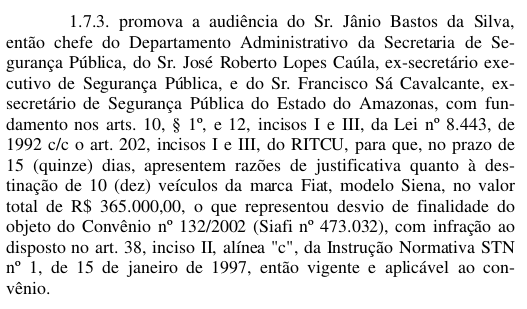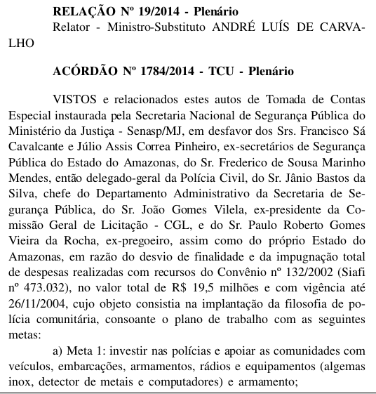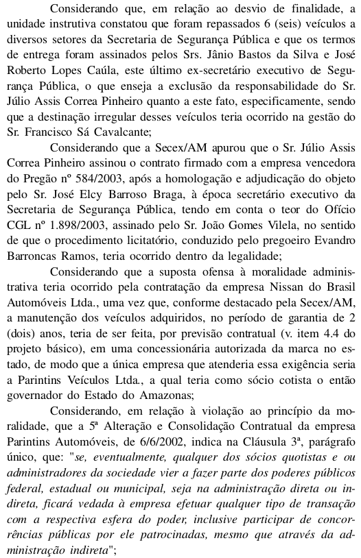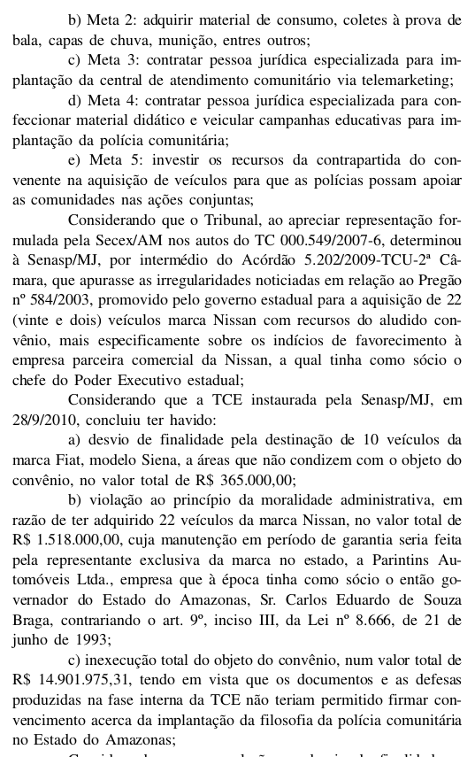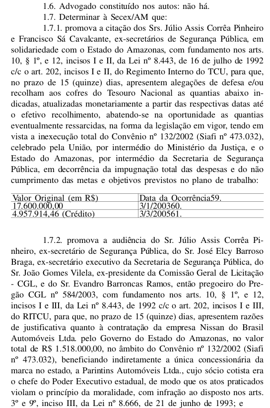 O Tribunal de Contas da União está intimando o ex-secretário de Segurança e atual conselheiro do Tribunal de Contas do Estado do Amazonas, Júlio Pinheiro e mais três servidores a devolver cerca de R$ 20 milhões aos cofres públicos. O Tribunal considerou que Pinheiro favoreceu em 2003, com a compra de carros, uma concessionaŕia que pertencia ao então governador da época e atual senador Eduardo Braga (PMDB). No acórdão publicado no Diário Oficial da União, que circulou dia 15 e que você pode ler abaixo na integra, o TCU considerou que Pinheiro beneficiou "indiretamente a única concessionároa da marca Nissan no Estado, a Parintins Automóveis Ltda, cujo sócio cotista era o chefe do Poder Executivo estadual, "de modo que os atos praticados violam o principio da moralidade".