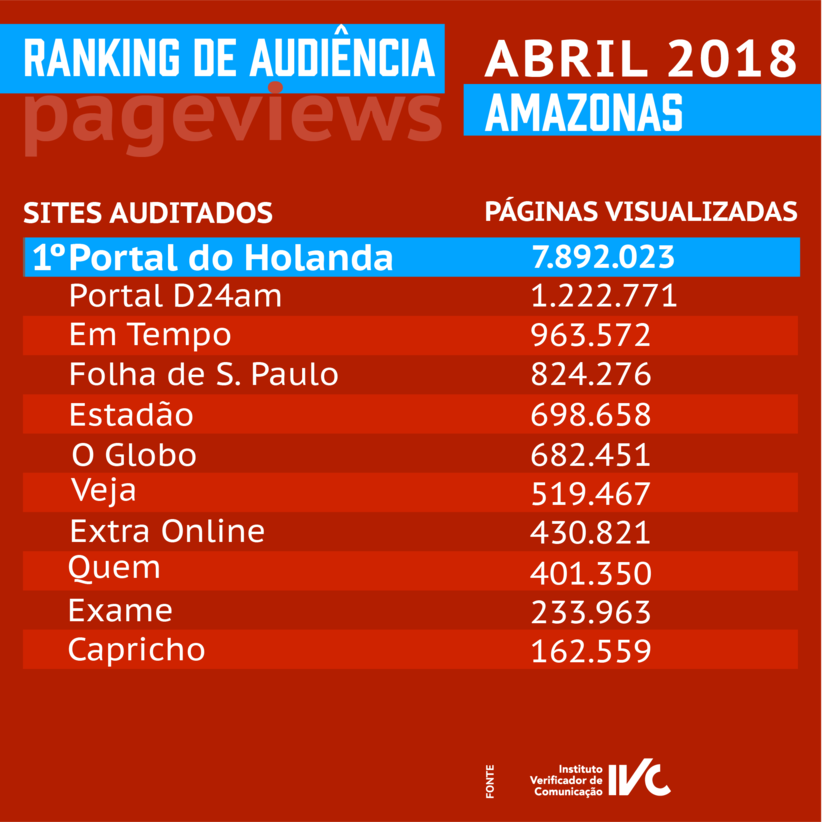 Clicando AQUI você tem acesso ao número de páginas visualizadas e de leitores, recorrentes ou não, que leem o Portal do Holanda, de acordo com o IVC Para ter uma visão da audiência dos demais sites e blogs do Amazonas , você pode consultar AQUI.