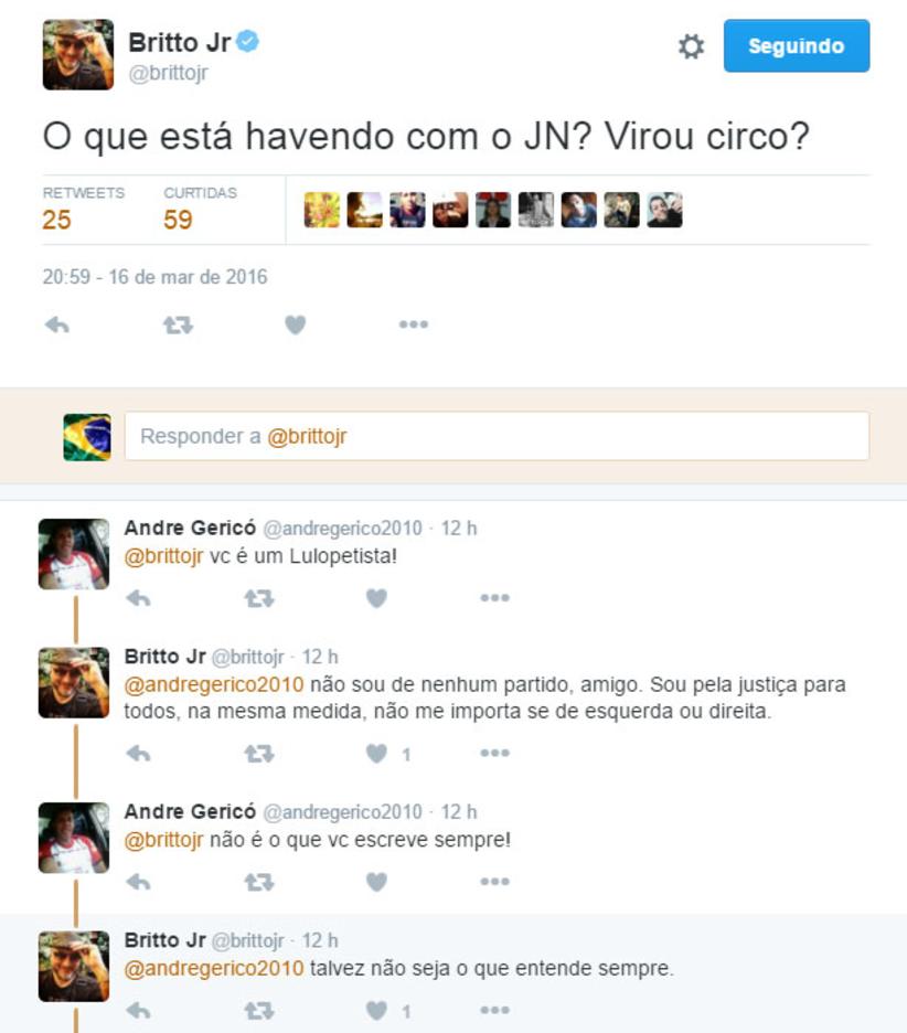 Britto Jr. criticou a edição da última quarta-feira (16) do Jornal Nacional que mostrou a indicação de Lula ao cargo de ministro da Casa Civil e a divulgação de grampos telefônicos.