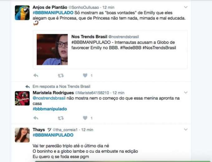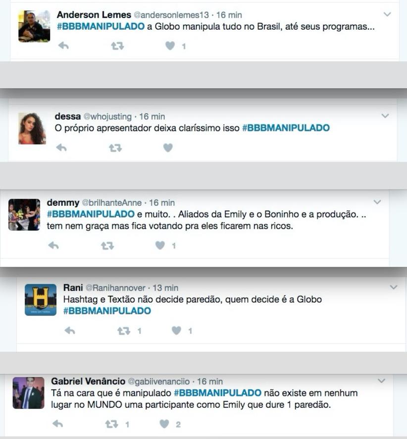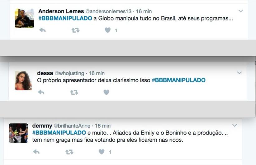 Nesta quinta-feira (9), a hashtag #BBBManipulado subiu para os Trending Topics (assuntos mais comentados) do Twitter, com usuários protestando contra o programa e prometendo parar de assistí-lo.