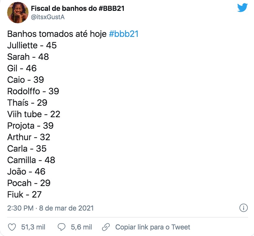 Começou a circular no Twitter uma lista com a contagem de todas as vezes que os brothers tomaram banho durante no BBB21.