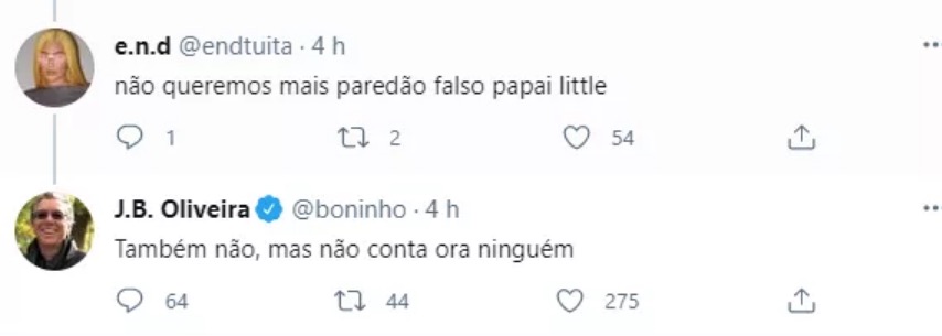 "Não queremos mais paredão falso, papai", escreveu um seguidor para Boninho no Twitter. "Também não, mas não conta pra ninguém", respondeu ele.
