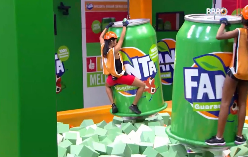 A dinâmica de habilidade e força é de revezamento. O objetivo era trazer duas latas do refrigerante gigantes, carregando o outro brother, de um lado da prova para o outro.