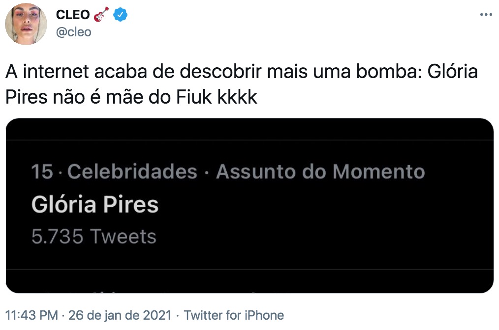 “A internet acaba de descobrir mais uma bomba: Glória Pires não é mãe do Fiuk kkkk”, brincou Cleo Pires, irmã de Fiuk.