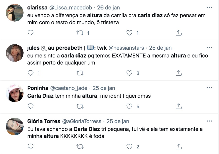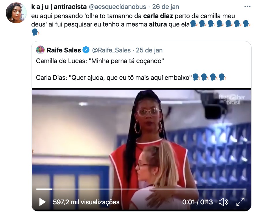 Toda vez que Carla Diaz surge ao lado de Camilla de Lucas no BBB21 a diferença de altura entre as duas dá o que falar na internet.