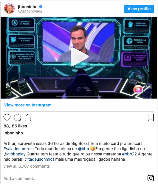 "Arthur, aproveita essas 36 horas de 'Big Boss'! Tem muito card pra brincar!", escreveu o diretor do programa.