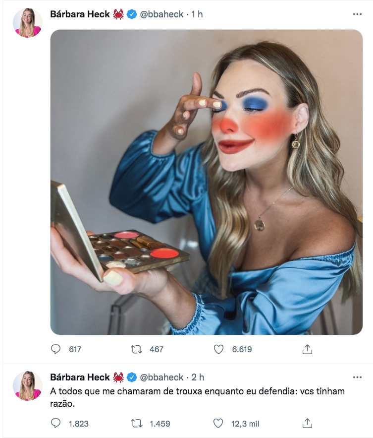 No Twitter, Bárbara comentou: “A todos que me chamaram de trouxa enquanto eu defendia: vcs tinham razão”, disse.