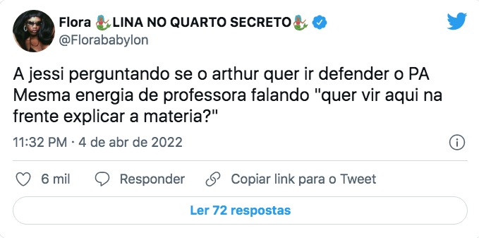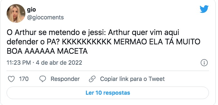 ‘Arthur, você quer vir defender o PA?’, disse. O ator tentou se justificar: “É que enquanto eu tava falando, vocês estavam falando”. A sister rebateu: “Eu não falei nada”.