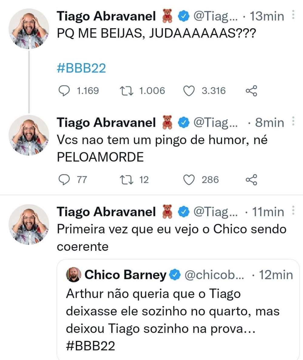 Dentro da casa, Abravanel se mostrou chateado com Arthur: “Quando ele diz que ele estaria do meu lado a qualquer circunstância, eu vi que não sou a prioridade dele. Porque na hora que ele viu as duplas se montando e viu que eu sobrei, ele não pensou em falar: ‘Lucão, desculpa, mas eu vou ficar com o Tiago’”, disse.