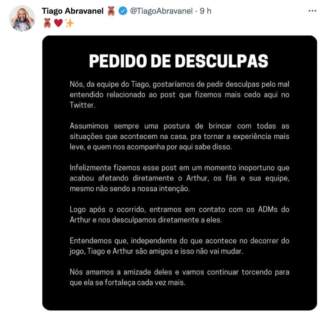 O tuíte deu o que falar e após críticas, a equipe de Tiago apagou a mensagem e pediu desculpas a Arthur. “Gostaríamos de pedir desculpas pelo mal entendido. (…) Infelizmente fizemos esse post em um momento inoportuno que acabou afetando diretamente Arthur mesmo não sendo a nossa intenção”.