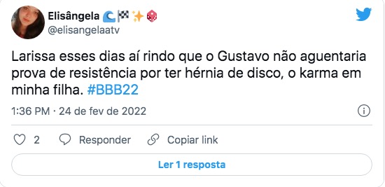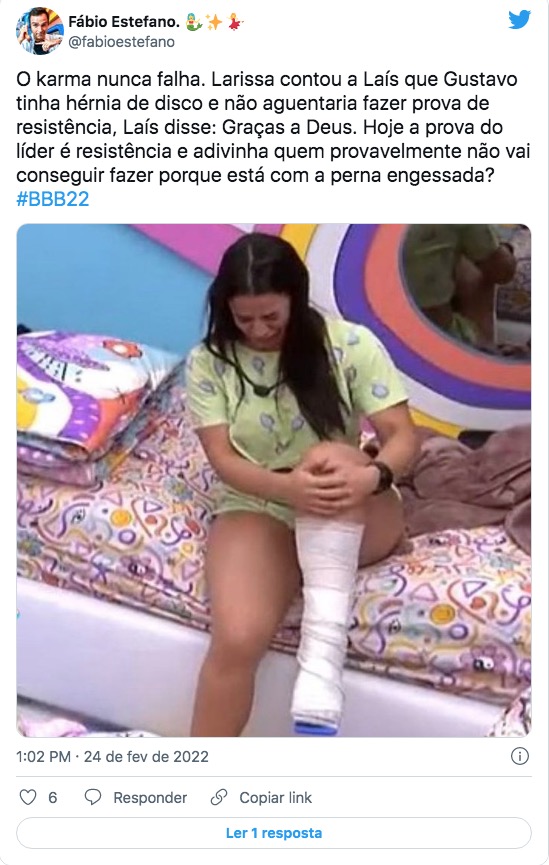 “O karma nunca falha. Larissa contou a Laís que Gustavo tinha hérnia de disco e não aguentaria fazer prova de resistência, Laís disse: Graças a Deus. Hoje a prova do líder é resistência e adivinha quem provavelmente não vai conseguir fazer porque está com a perna engessada?”, comentou outra.