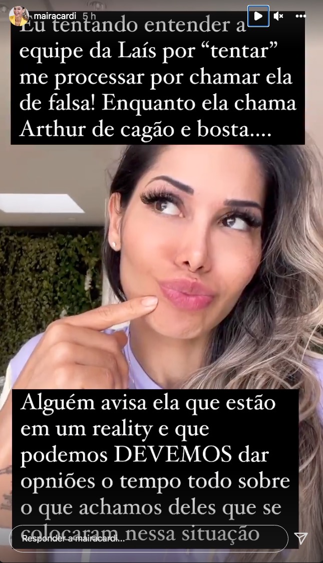 A coach ainda publicou nos stories: “Eu tentando entender a equipe de Laís por tentar me processar por chamar ela de falsa! Enquanto ela chama Arthur de cagão e bosta... Alguém avisa ela que estão em um reality e que podemos e devemos dar opiniões o tempo todo sobre o que achamos deles, que se colocaram nessa situação”.