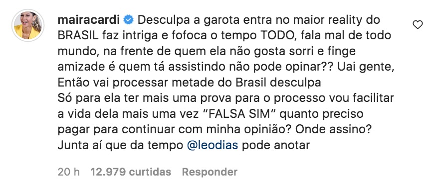 “Desculpa, a garota entra no maior reality do Brasil, faz intriga e fofoca o tempo todo, fala mal de todo mundo, na frente de quem ela não gosta sorri e finge amizade e quem tá assistindo não pode opinar? Uai gente, então vai processar metade do Brasil, desculpa. Só para ela ter mais uma prova para o processo vou facilitar a vida dela mais uma vez ‘FALSA SIM’ quanto preciso pagar para continuar com minha opinião? Onde assino?”, escreveu Maíra, que participou do BBB9.