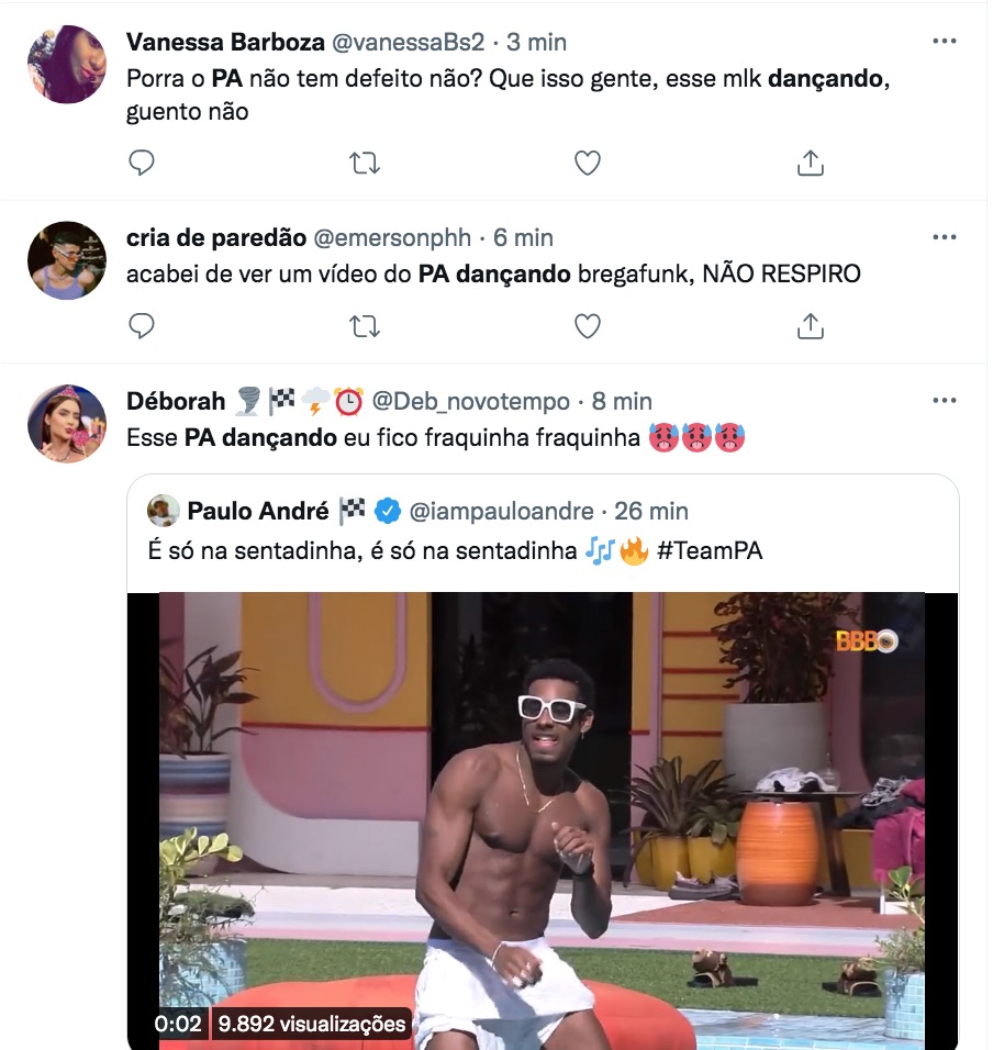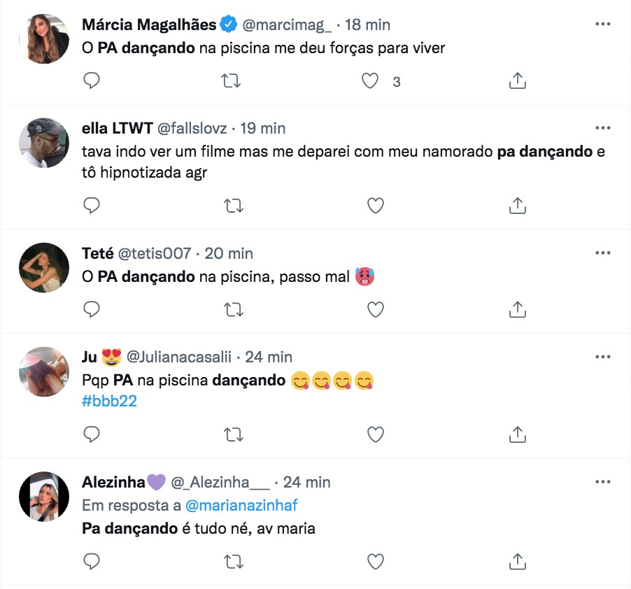 “PA é gostoso demais”, “PA dançando me deu forças para viver” e “Passo mal com o PA dançando na piscina” foram alguns dos comentários.
