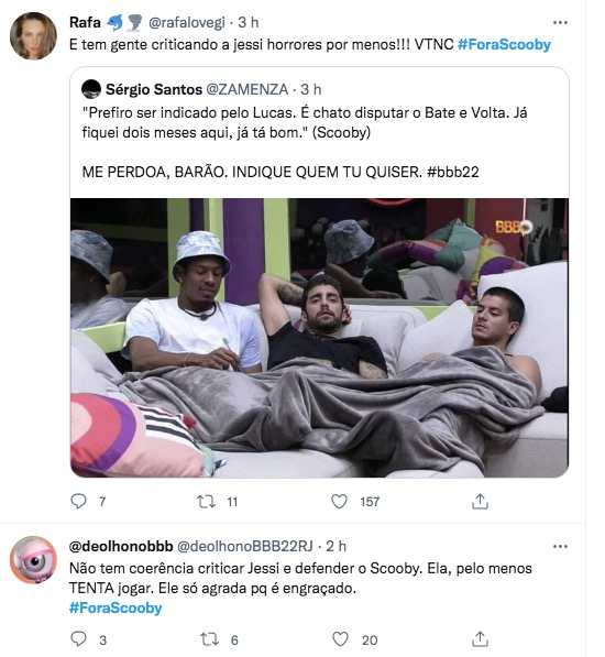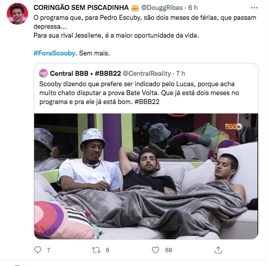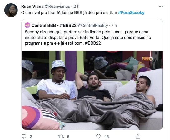 Telespectadores do pay per view do BBB22 puxaram um "#ForaScooby" nas redes sociais neste sábado (12), após uma sequência de falas do surfista demonstrando falta de interesse em permanecer no reality show. Neste sábado, Scooby - que foi o primeiro a sair da Prova de Resistência do líder na noite anterior - afirmou que não queria ganhar a Prova do Anjo.