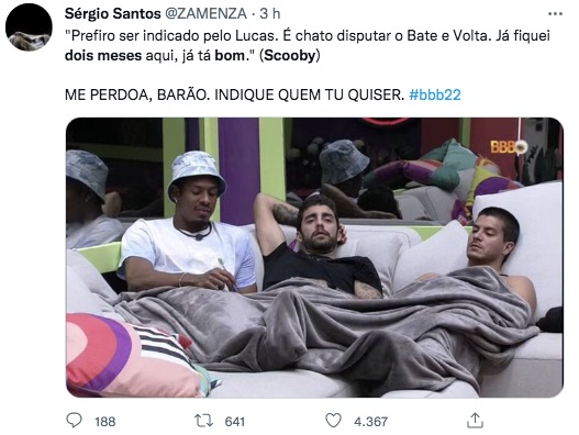 Além disso, ele comentou que seria melhor ser indicado direto ao paredão pelo líder Lucas, para não se dar ao trabalho de disputar a prova bate-volta. "Prefiro ser indicado pelo Lucas. É chato disputar o Bate e Volta. Já fiquei dois meses aqui, já tá bom", disse ele.