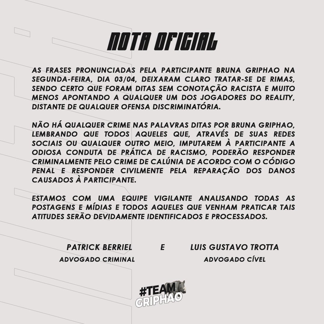 “A atitude da BBB Bruna Griphao é inaceitável, há muito tempo o movimento negro vem defendendo a criminalização das falas racistas mesmo que em caráter de brincadeira, porque brincadeiras também ofendem e machucam, sendo assim não é um assunto novo em debate “, continuou.