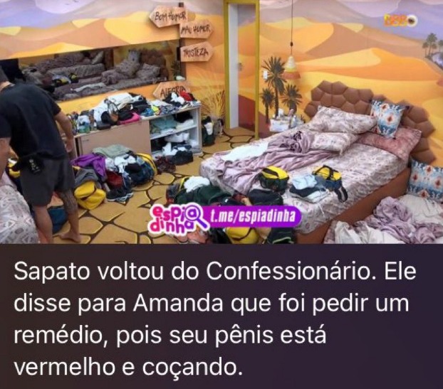 O brother Cara de Sapato foi ao confessionário do BBB 23, neste domingo (26), e chamou a atenção das redes sociais, pois as câmeras foram desativadas. O brother revelou o motivo de sua ida ao confessionário. Em conversa com Amanda ele falou que foi pedir um remédio para o pênis, que está vermelho e coçando.