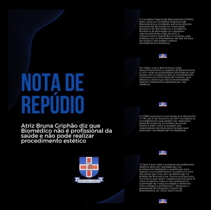 "O Conselho Federal de Biomedicina (CFBM), bem como os Conselhos Regionais de Biomedicina e entidades parceiras (Escola Nacional de Biomedicina, Associação Brasileira de Biomedicina e Academia Brasileira de Biomedicina) repudiam veementemente a fala da atriz e influenciadora digital Bruna Griphao, que enfatiza que os biomédicos não são da área da saúde e não podem realizar procedimentos estéticos.