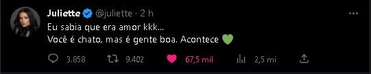 "Eu sabia que era amor kkk? Você é chato, mas é gente boa. Acontece", escreveu a ex-BBB no Twitter.