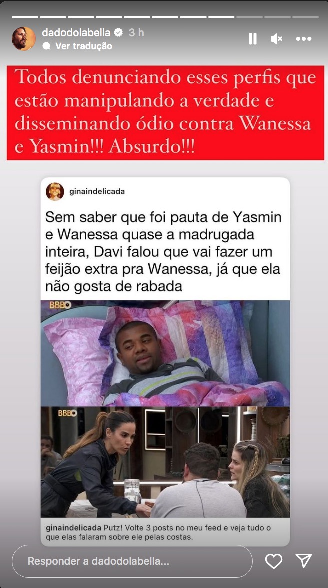 A página Gina Indelicada rebateu a declaração de Dado: “O Dado afirmou em seu Instagram que estamos disseminando ódio contra Wanessa e Yasmin. Quando as atitudes de uma participante não agradam o público é mais fácil culpar quem está cobrindo o reality do que encarar a situação”.