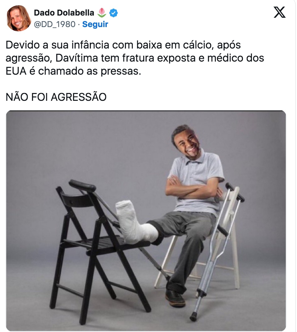 Mais cedo, Dado chegou a debochar de Davi pelo fato de ter pedido a expulsão de Wanessa por agressão. “Devido a sua infância com baixa em cálcio, após agressão, 'Davítima' tem fratura exposta e médico dos EUA é chamado as pressas”, ironizou.