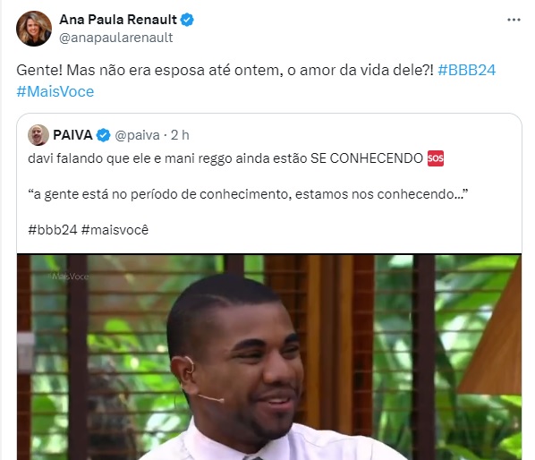 A fala de Davi acabou sendo criticada por alguns internautas e até a ex-bbb Ana Paula Renault comentou: “Gente! Mas não era esposa até ontem? O amor da vida dele?”.