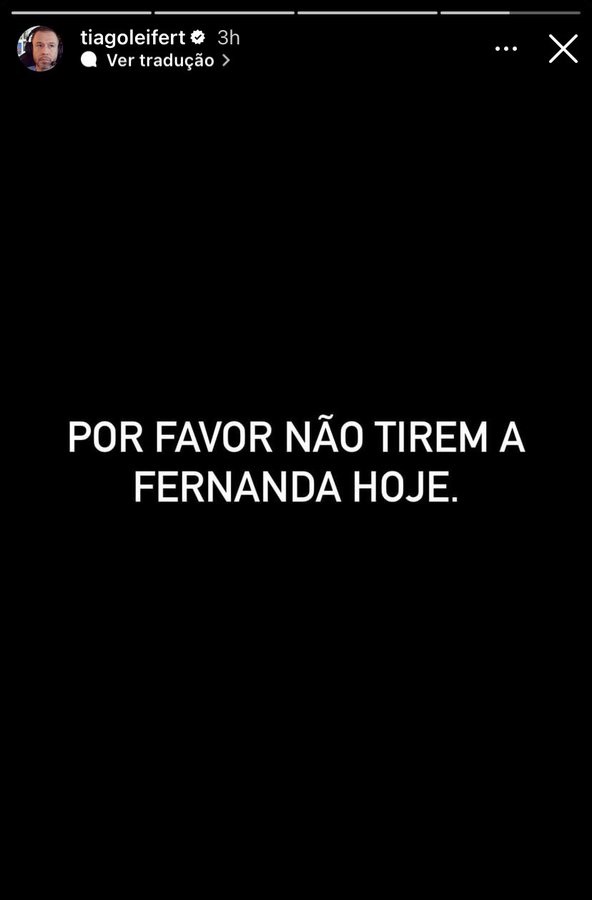 A manifestação de Tiago vem em meio a enquetes que apontam que Fernanda tem grandes chances de ser eliminada.