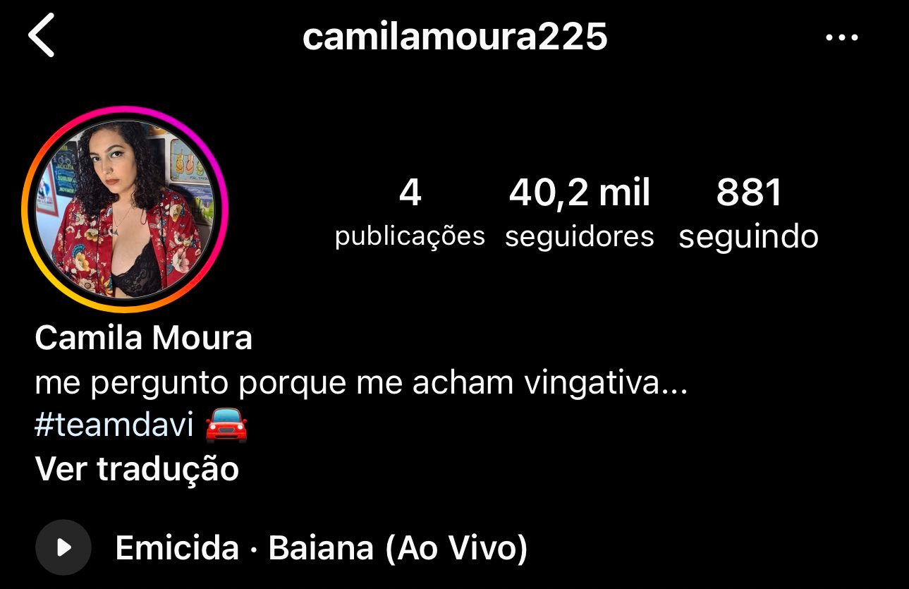 Por fim Camila declarou torcida agora para Davi, em mensagem na Bio do Instagram, onde também anexou a música Baiana e onde ainda escreveu a frase: "Me pergunto porque me acham vingativa...".