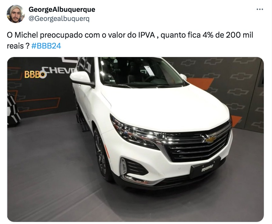 O carro que Michel ganhou é modelo Equinox avaliado em mais de R$ 200 mil. Dependendo do valor de base estabelecido por cada estado, o IPVA pode chegar a R$ 8 mil.