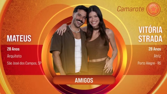 Vitória Strada e Mateus Pires são amigos e fazem parte do grupo Camarote do #BBB25! Vitória é atriz, tem 28 anos e vem de Porto Alegre (RS). Mateus é arquiteto, tem 26 anos e vem de São José dos Campos (SP). #BigDay #RedeBBB pic.twitter.com/JoF8keaG2T